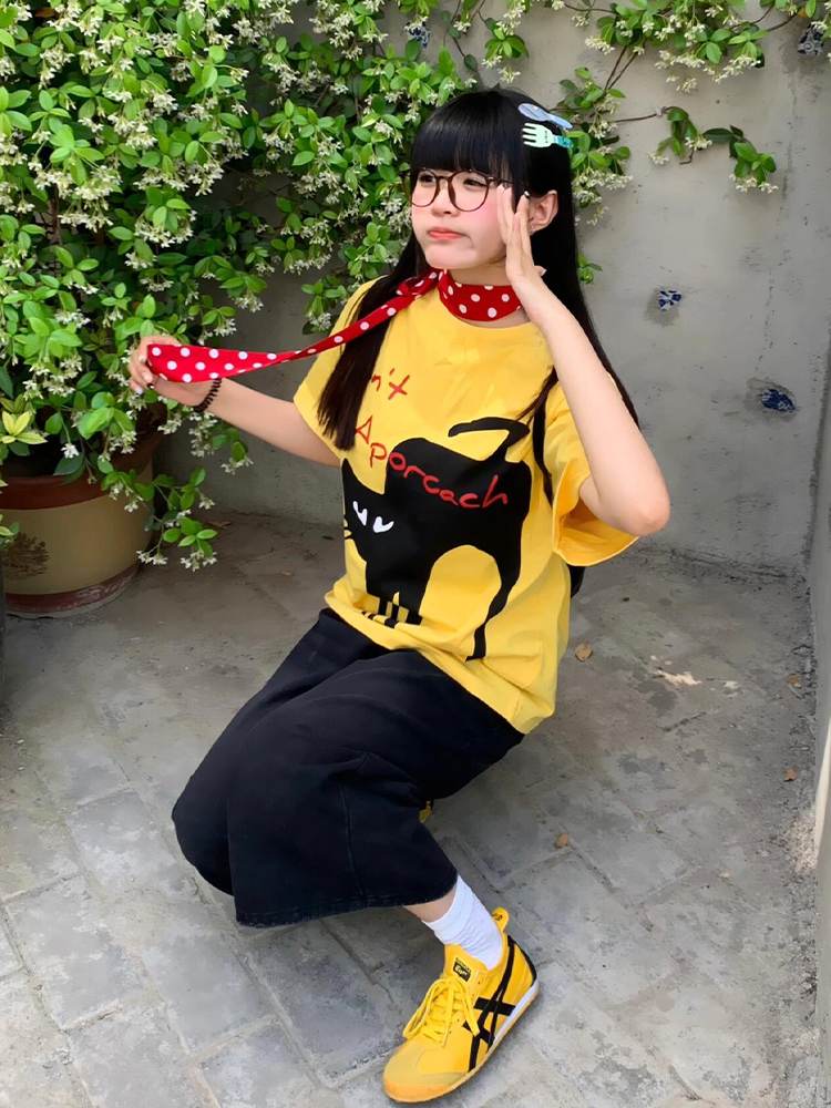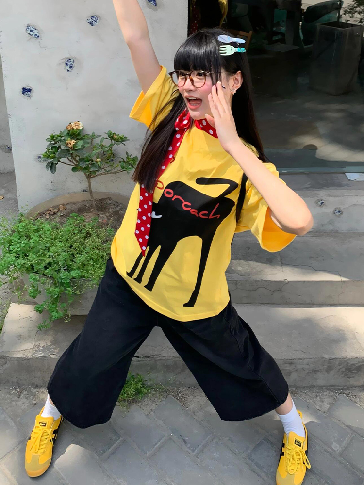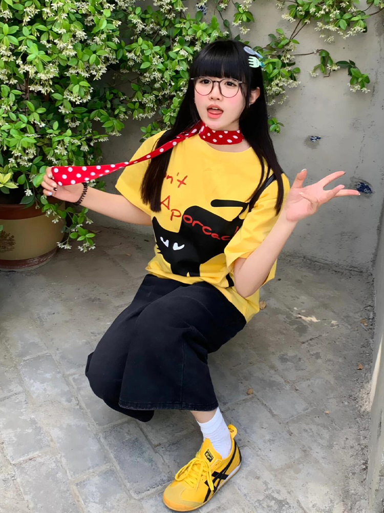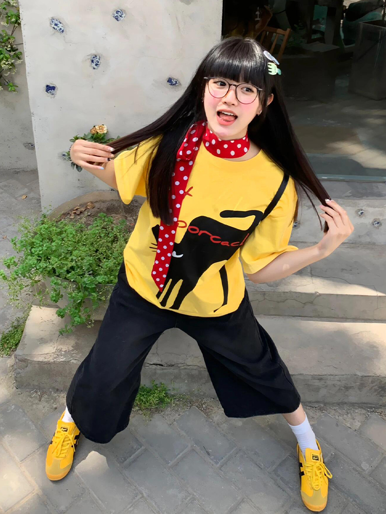 Concert Outfit Yellow Short Sleeve T- shirt Women Summer Lazy Cat Print, Loose Fit Neck Top, Casual Wear